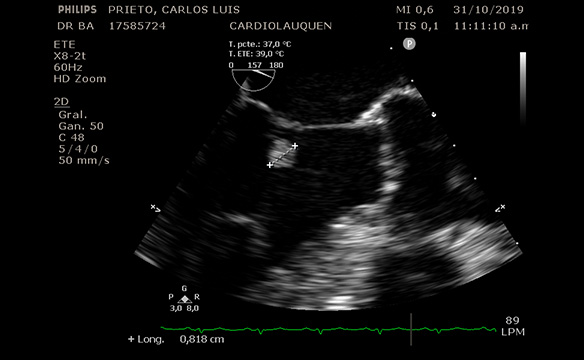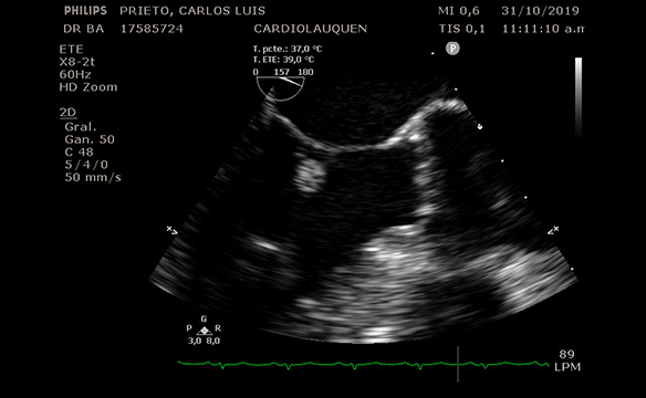 ECO DOPPLER y ETE, equipo Phillips 3D (Dra. Barr y Tec. En imágenes Lucia Vacas): imagen en Valva Mitral redondeada de 0.8 mm, muy móvil, sin compromiso de ecoestructura Mitral luego fue evaluado en consulta con Dr. Avegliano, confirmando la sospecha de que por las características de dicha masa puede corresponder a Fibroelastoma Papilifero. Dada la alta incidencia de embolia, se envía a Cirugía Cardiovascular.